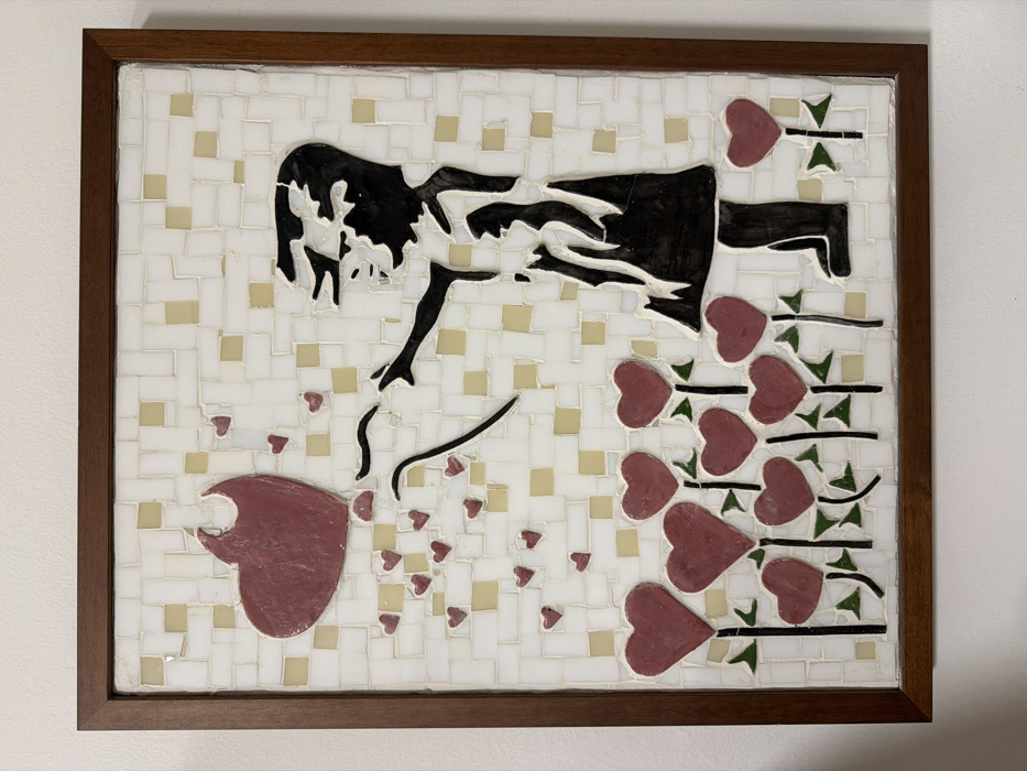 A framed mosaic artwork is mounted on a plain white wall