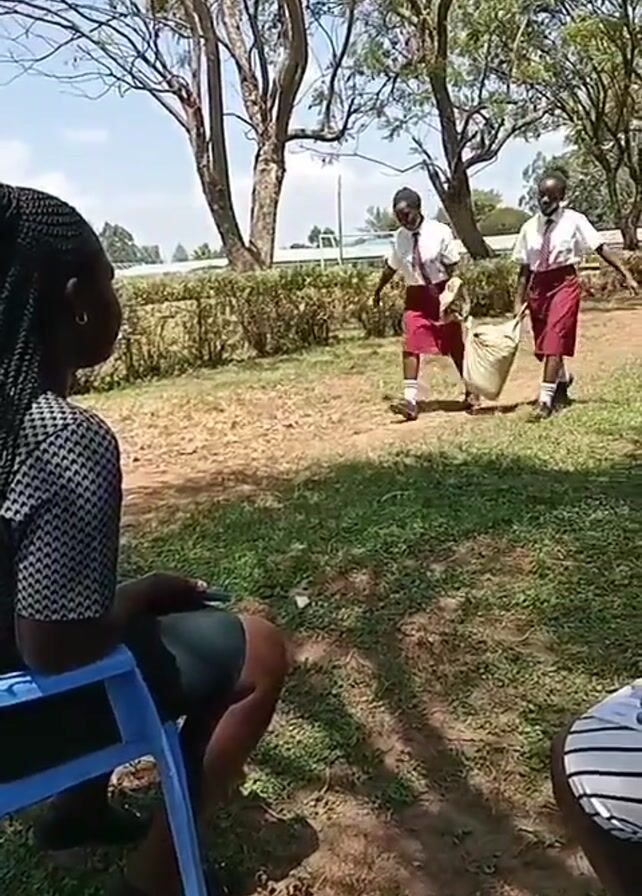 Two girls wearing white shirts and red skirts are carrying a large bag across a grassy field. One girl is seated in a blue plastic chair, watching them. There are trees in the background and a small building to the right of the frame. The girls are walking towards the building. A motorcycle is parked next to the building. The sky is blue and sunny.