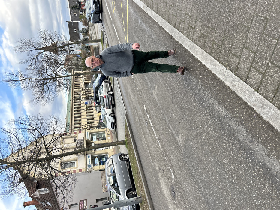 The image depicts an urban street scene in Hoenheim, France, under an overcast sky with visible blue patches. In the foreground, a single male subject, approximately 50-70 years old with glasses and short, light-colored hair, walks on the asphalt road. He wears a grey quarter-zip fleece-style sweater, dark green corduroy trousers, and brown lace-up shoes. His left hand is in his pocket, and he is positioned parallel to a grey paver sidewalk, which is separated from the road by a continuous white line. The asphalt road shows wear, cracks, and some damp patches, with white dashed and solid lane markings visible. Further down the road, yellow diagonal markings are present. To the left, a multi-story building features a mansard roof with red-brown tiles, dormer windows, and a cream-colored facade with red-brown decorative banding. A dark metal balcony extends from the first floor. The ground floor houses commercial establishments with signs including "OTT" and "BOUTIQUE CADEAUX MAISON LIBRE". A silver minivan-style car (Opel Meriva-like) is parked adjacent to this building. Further into the mid-ground, a longer, multi-story building with a flat, possibly green roof and multiple windows stands behind parked vehicles. These include a white compact hatchback, a silver compact hatchback, and a dark sedan. Bare deciduous trees are scattered throughout the scene, one prominently in the mid-left foreground. In the background to the right, a distinctive white building with a brown, pointed spire roof (possibly a church) is partially visible behind trees. A dark grey SUV is parked on the far side of the main road. The overall environment suggests a typical European town center.