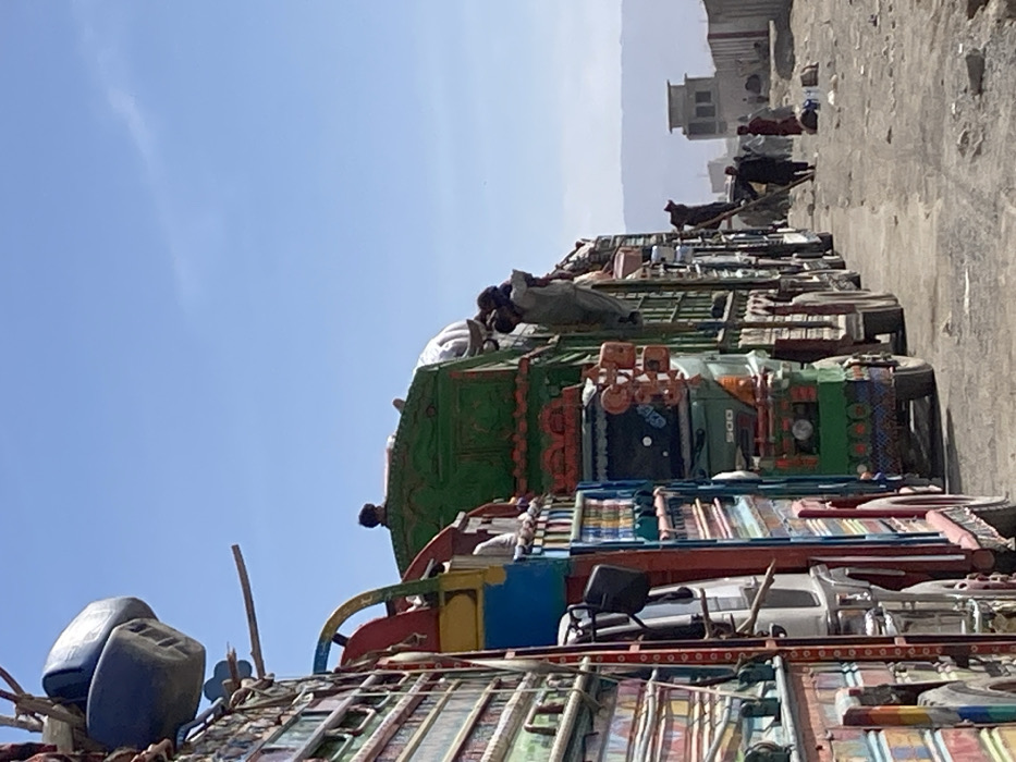 - "The image displays a line of approximately eight brightly decorated commercial trucks on an unpaved, dusty road in Chaman City Tehsil, Pakistan" by FM-7ELnX2, licensed under CC BY 4.0