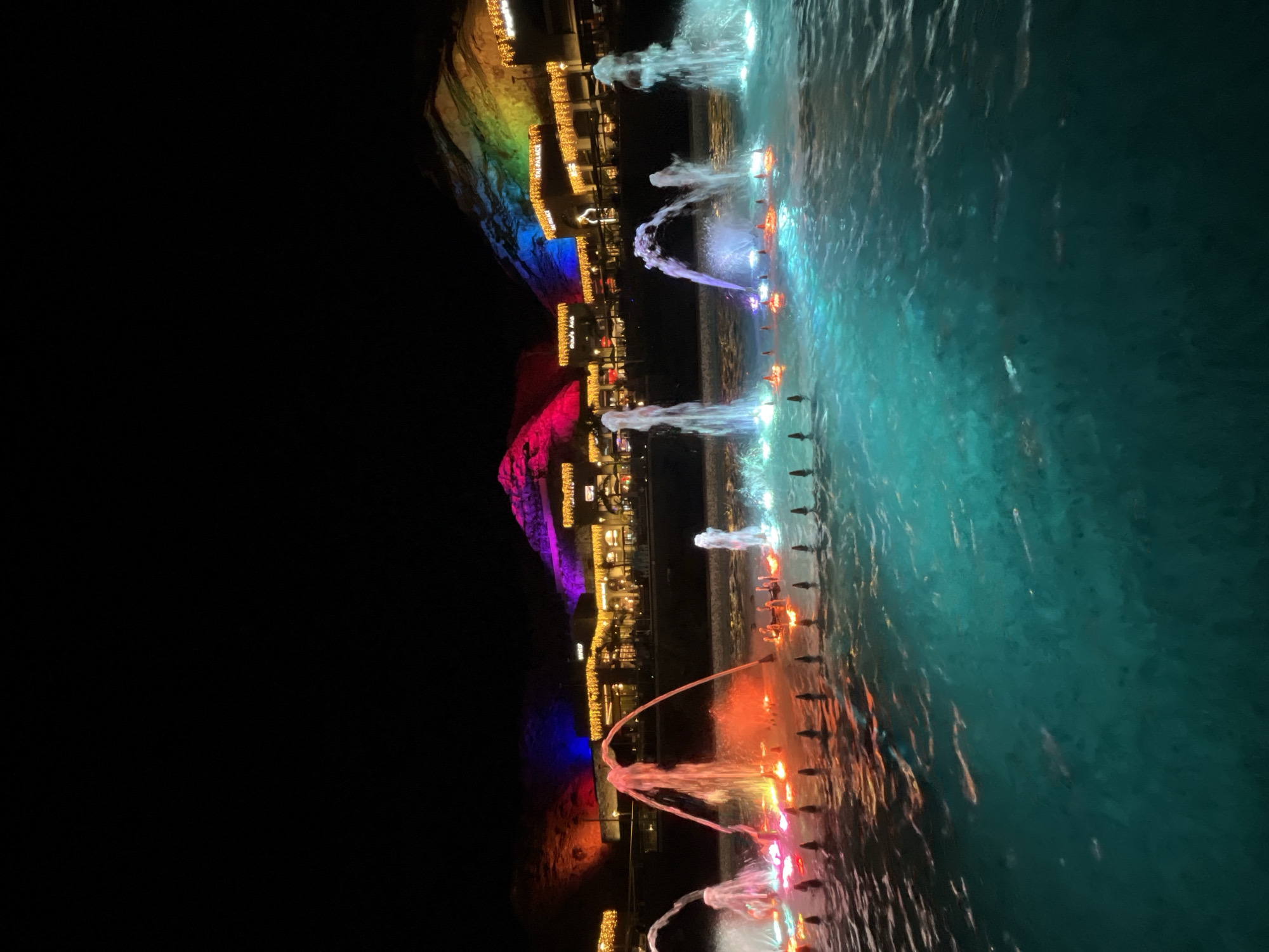 The scene depicts an outdoor evening environment in El Chaparral, Spain, focusing on an illuminated water feature and commercial buildings backed by colored mountains. In the foreground, a large body of water, likely a fountain or decorative pond, features multiple active water jets. These jets are illuminated from below, displaying colors including red, orange, pink, blue, purple, and cyan. Small, dark, conical nozzle structures are visible within the water, arranged in lines. In the midground, a complex of commercial buildings, possibly a shopping or entertainment center, stands behind the water feature. These structures are adorned with warm yellow string lights along their facades and rooflines. The name "TAJ PALACE" is visible on a sign on one of the buildings. The far background consists of natural rock formations or mountains, which are artificially illuminated with broad swaths of colored light, transitioning from red and orange on the left to blue, purple, and a rainbow spectrum on the right. The sky above is uniformly dark, indicating nighttime. No discernible individuals are present in the frame.