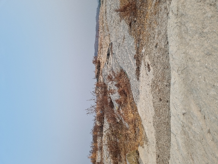 The scene depicts an expansive, arid outdoor area in Kammavaripalli, India, under a clear, pale blue sky. The foreground consists of light grey, compacted ground with visible small aggregates and a scattering of dark, granular debris. Immediately beyond, the terrain becomes irregular, characterized by numerous piles and uneven surfaces composed primarily of light grey gravel or crushed stone. Scattered throughout the midground and extending into the background are clusters of dry, brown, shrub-like vegetation. The distant horizon line is flat, where the land meets the sky. No individuals, animals, or man-made structures are present or discernible within the frame. The environment appears desolate and dry.