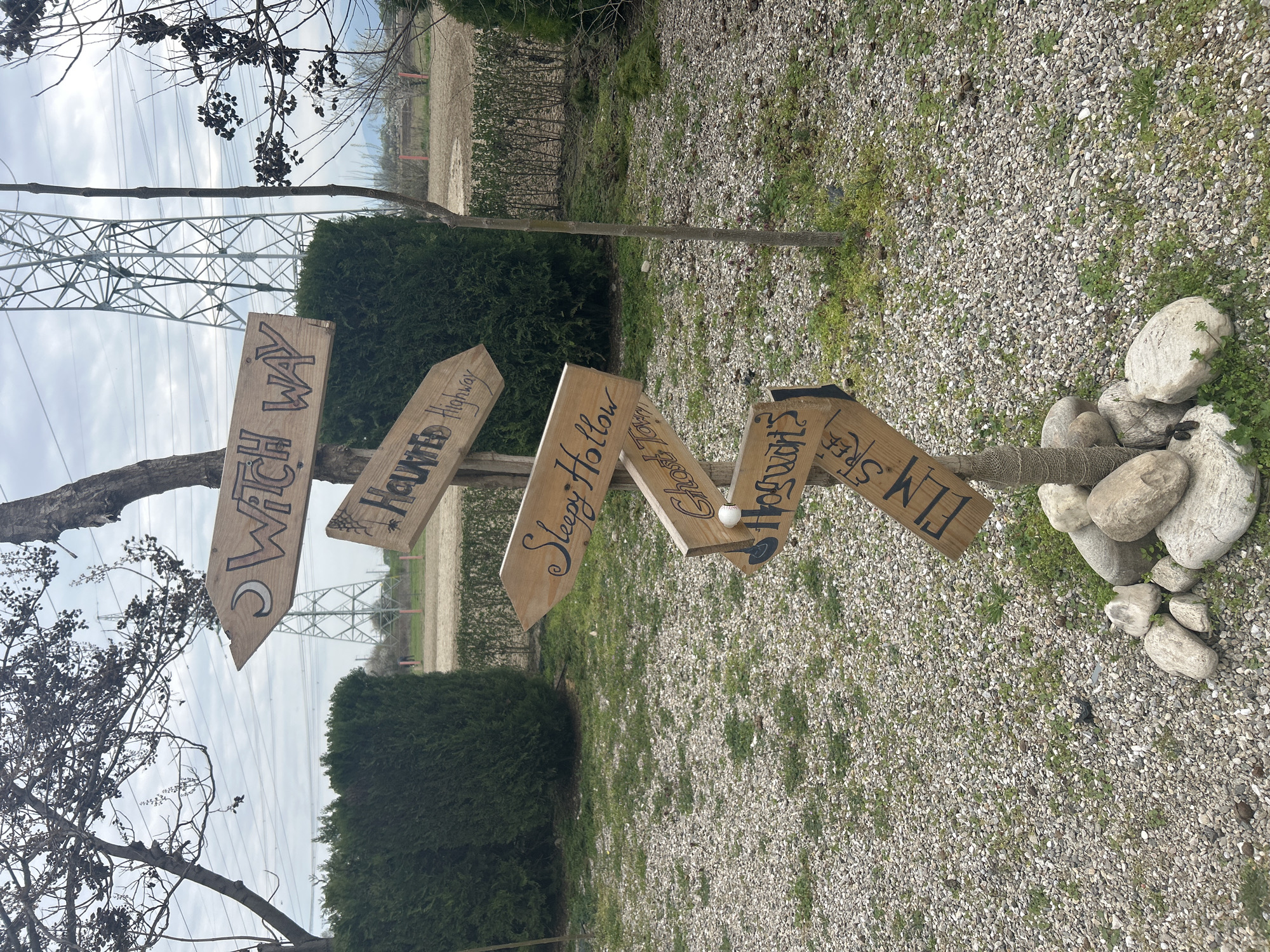 wooden signpost with directional signs pointing to "Witch Way," "Haunted Highway," "Sleepy Hollow," "Ghost Town," and "Elm Street." The signpost is located outdoors in a gravel area with some greenery and large rocks at its base. In the background, there are bushes, fields, and a high-voltage power line tower visible against a cloudy sky. I can't provide a specific location in Plovdiv, Bulgaria without more context about the image's origin.