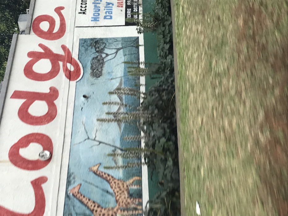 This image displays a building facade in Johannesburg, South Africa, featuring prominent signage and a mural, captured from a moving vehicle as indicated by horizontal blur across the scene. The upper portion of the wall is white, bearing large red letters spelling 'Lodge'. Below this, a mural depicts a blue-sky savanna landscape with two brown-spotted giraffes on the left, walking rightwards, alongside sparse trees and distant blue mountains. Several tall, spiky, light-colored plants are painted within the mural. To the right, additional signage on a white background advertises "Accommodations", "Hourly", "Daily", "AVA", "SECURE PARKING", and "UL DSTV". A dense line of dark green leafy vegetation, interspersed with taller spiky plants featuring light-colored inflorescences, stands directly in front of the wall, partially obscuring the lower mural section. The immediate foreground shows a strip of predominantly dry, yellowish-green grass, heavily affected by motion blur. No people are visible.