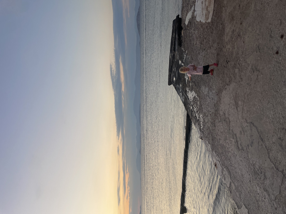 The image captures a coastal scene at dusk in Megalochori, Greece. A young child, with light-colored hair, wearing a light-colored striped shirt, dark shorts, and red shoes, stands on a weathered concrete pier. The child's left arm is extended forward, pointing towards the left, while the right hand holds a small, dark object. The concrete pier is uneven and appears aged, with a portion extending into the water on the left, forming a lower, narrower barrier. A light-colored rope is loosely laid on the concrete surface, extending from the right side of the child towards the water. A fragmented, light-colored object, possibly a piece of wood or concrete, rests on the far right edge of the pier. The water surface is calm, reflecting the twilight sky. In the mid-distance, a series of dark landmasses or islands are visible along the horizon. The sky above exhibits a gradient of colors, transitioning from a warm, muted orange-yellow near the horizon to a lighter, cool blue-purple overhead, with scattered, elongated clouds present above the distant land. The overall lighting indicates either sunset or a very early twilight period.