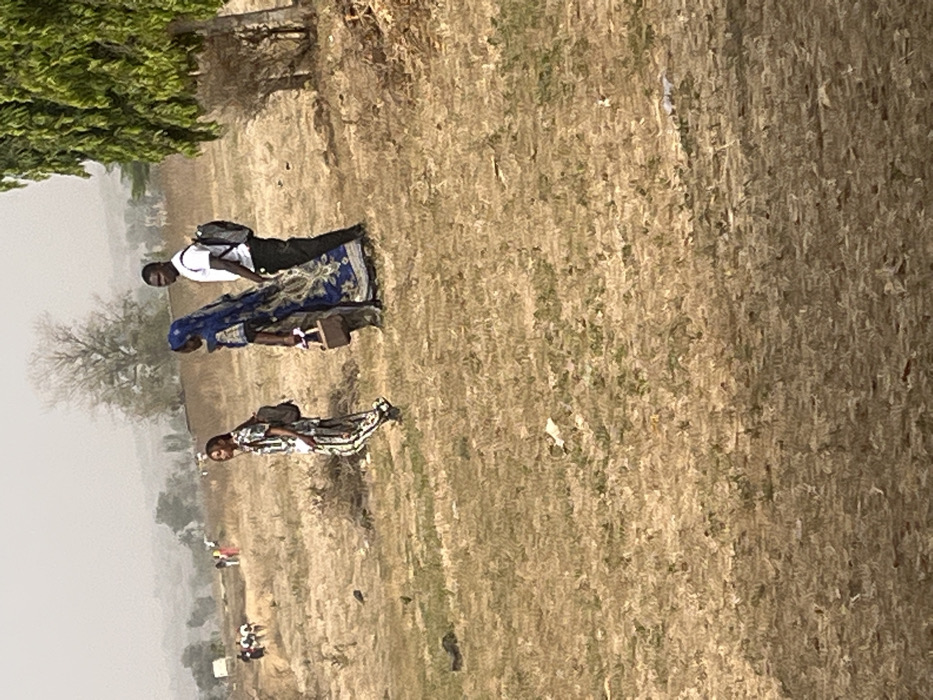 The image displays a dry, open landscape in the city of Nassarawa, Nigeria, under a light, hazy sky. The foreground and midground consist of arid, light brown earth with sparse patches of green vegetation. In the midground, three individuals are observed walking from left to right. The leftmost individual is a female, dressed in a light-colored patterned long-sleeved top and matching long pants, with a dark backpack on her back. The central individual is a female, wearing a long blue garment with white patterns and a blue head covering, holding a light brown, structured bag in her right hand. The rightmost individual is a male, wearing a white short-sleeved shirt and dark pants, with a dark backpack. All three are moving in the same general direction, with their backs partially to the camera. In the far background to the left, a smaller group of 5-7 individuals is also visible, walking in the same direction. The background includes distant, hazy hills and a bare deciduous tree. A tree with dense green foliage is partially visible on the far right of the foreground.