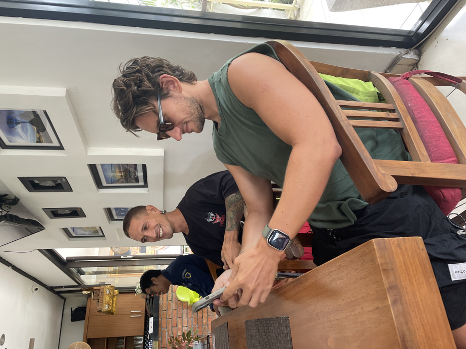 Three men are at a table, two standing and one seated. The man closest to the camera holds a smartphone, his wrist adorned with a smartwatch. He is wearing a green tank top. Behind him, another man, wearing a black t-shirt with tattoos on his arm, smiles towards the camera. In the background, the third man is seated and appears to be looking at his phone. The setting appears to be indoors with art or photography hanging on the wall. A wooden chair is partly obscuring the view.