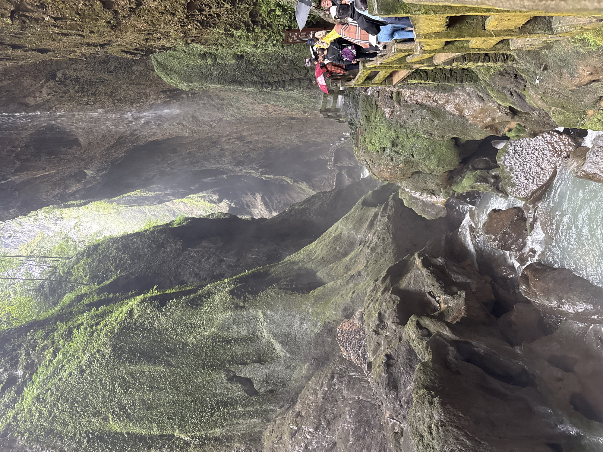 The image depicts a deep, moss-covered gorge in Wulong District, China. A group of people is standing on a walkway at the top of the gorge, some holding umbrellas. A waterfall flows down the side of the gorge, and a stream runs through the bottom. The gorge walls are steep and covered in vegetation.