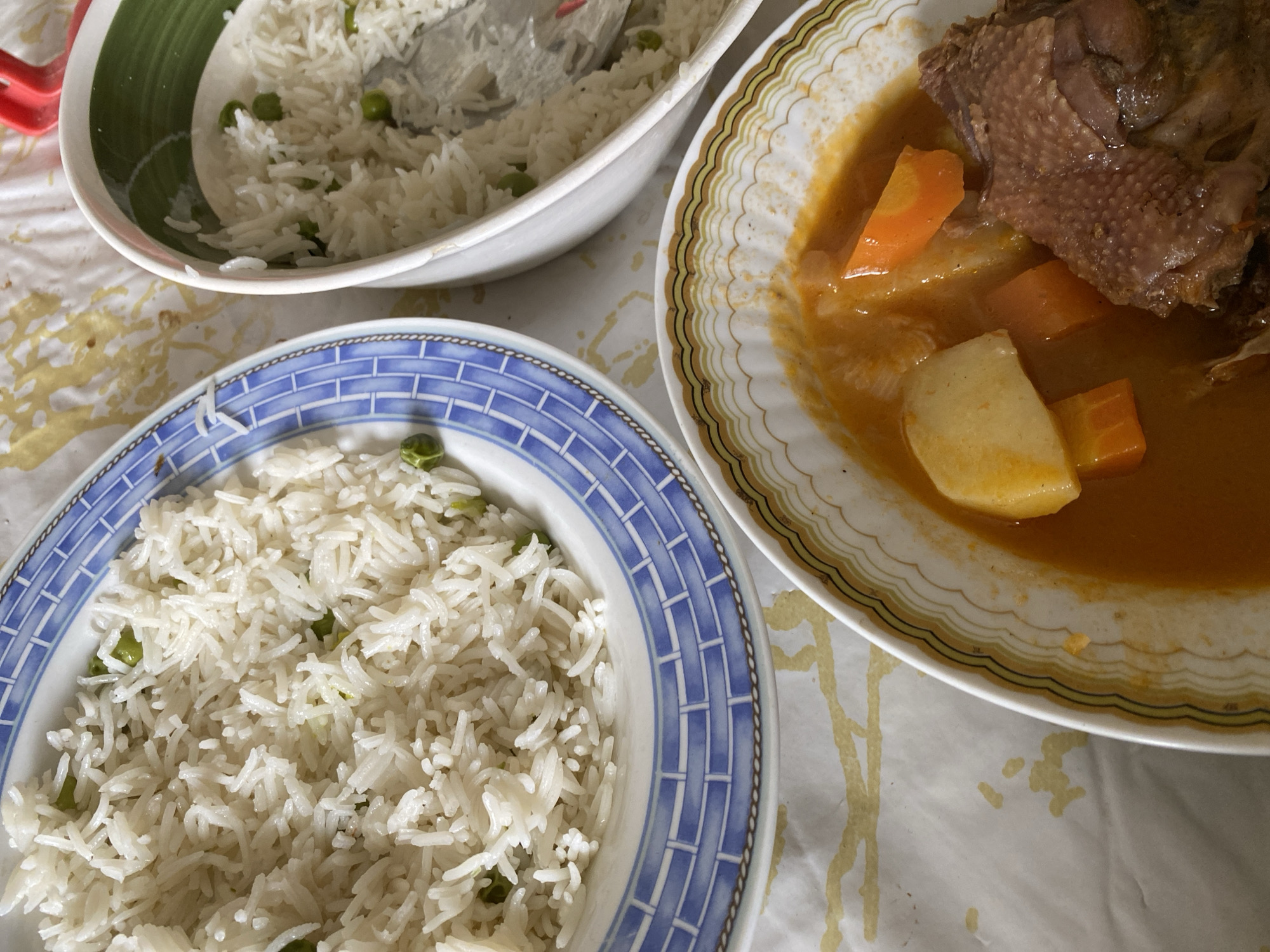 An overhead view captures a meal served on a table in Baraki, Algeria. The table is covered with a white sheet featuring irregular gold-colored patterns and scattered yellowish stains. Three dishes are present: a white ceramic plate with a blue and white geometric brick-patterned rim holds white rice interspersed with green peas. To its right, a white ceramic bowl with a green and white striped rim also contains white rice and green peas, with a silver spoon partially visible within. At the bottom, a white ceramic bowl with a gold and white scalloped rim contains a stew or tagine featuring a cooked piece of poultry, distinct potatoes, and sliced carrots submerged in an orange-hued sauce. A red handle is partially visible at the far upper right.