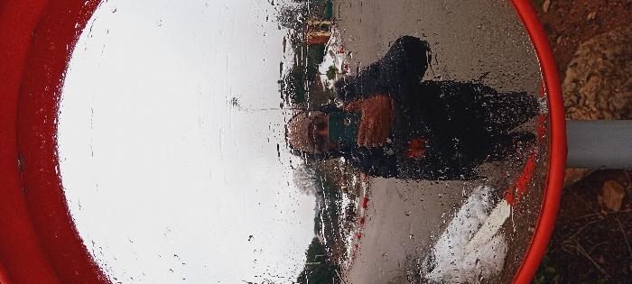 A self-portrait is captured via a rain-splashed convex mirror on an overcast winter day in Ifrane, Morocco