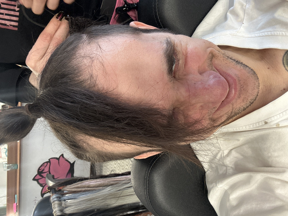 An indoor scene depicts a male individual seated in a black salon chair, undergoing a hair procedure, likely in a salon located in Saratov, Russia. The man, with dark brown hair, has a portion of his hair tied in a small topknot and a significant amount falling over his right eye. His scalp on the sides and crown shows areas of thinning or recent shaving. He displays a wide, squinting smile, and his nose appears reddish. He is wearing a white collared garment, possibly a salon cape, with a dark, circular tattoo visible on his lower neck. Behind him, a second individual, presumably a stylist, is visible only by their hands and torso. The stylist's hands, with dark-painted fingernails, are actively manipulating the man's hair, appearing to section or prepare it. The stylist wears a dark top with light-colored text, possibly Cyrillic, partially visible. In the background to the left, a display rack holds numerous strands of hair extensions in various colors, from dark to light. A large pink rose mural is visible on the wall, reflected in a mirror behind the display. A clear glass is also visible in the reflection. A dark hair clip rests on a pink surface near the stylist's hands.