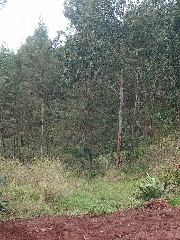 The scene is an outdoor environment in Ndeiya, Kenya, dominated by natural vegetation. The foreground features disturbed, dark red-brown soil containing scattered dry plant matter. A portion of a green, pointed-leaf plant is visible at the lower left. At the lower right, a cluster of broad-leaved green plants, consistent with succulents, is situated on a small earthen mound. The midground consists of an uncultivated area of mixed green grass and desiccated, light-colored herbaceous growth. The background is defined by a dense stand of tall, slender trees, consistent with eucalyptus species, featuring green canopies. These trees form a thick forest boundary. The sky is overcast, appearing bright grey-white above the treeline. No individuals, actions, or specific man-made objects are discernible within the frame.