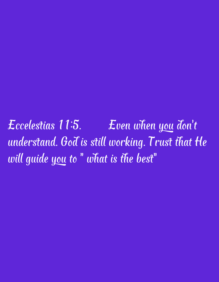 The image displays a religious quote set against a solid purple background. In white, cursive font, it reads "Ecclesiastes 11:5. Even when you don't understand, God is still working. Trust that He will guide you to 'what is the best'." The text delivers a message of faith and reassurance, suggesting reliance on divine guidance during times of incomprehension.