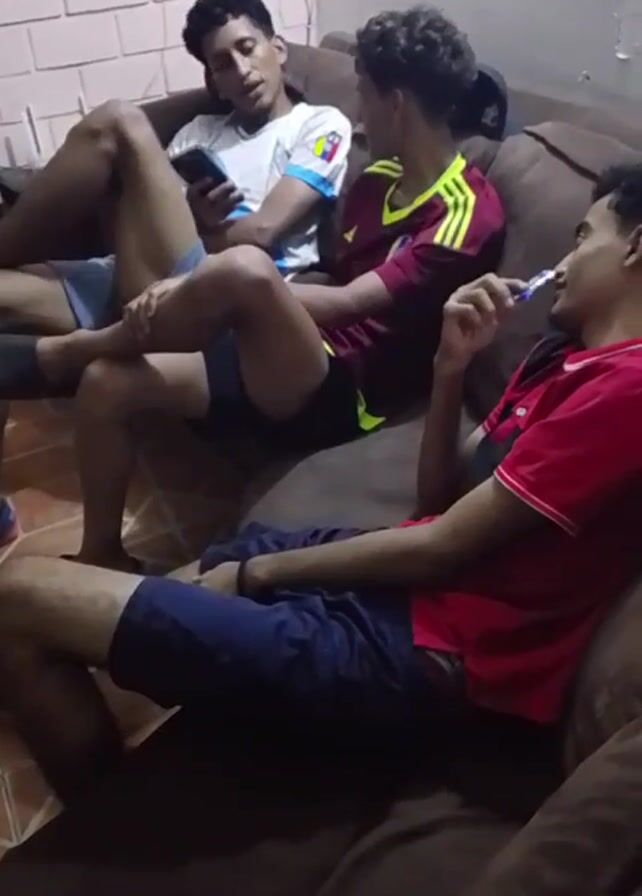 Three young men are sitting on a brown couch in what appears to be a home setting. The first man, wearing a white shirt with blue accents and the Venezuelan flag, is looking at a smartphone. The second man is wearing a maroon shirt with yellow accents and is holding a pen-like object in his hand. The third man, wearing a red shirt and blue shorts, is looking to the side and appears to be engaged in a conversation. The room has white brick-like walls.