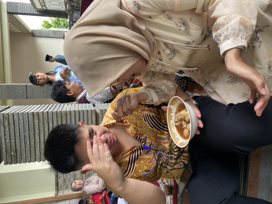 A man in a patterned shirt holds up his hand, obscuring part of his face. A woman in a hijab and patterned blouse feeds him from a bowl of food. Behind them, several other people can be seen, including a girl in a blue shirt and a man in a peci. The background shows parts of a house and a stack of gray blocks.