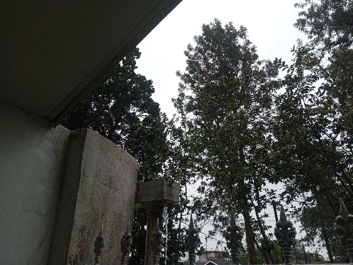 This image depicts an outdoor scene in Ciherang, Indonesia, captured from a low, upward-angled perspective. In the immediate foreground, to the left, is the underside of a light-colored concrete or stucco overhang, with a portion of an adjacent vertical concrete wall or pillar visible. This wall exhibits surface discoloration and multiple fine cracks. A decorative dark metal fence or railing, featuring several spiky, ornate finials, extends across the lower-middle portion of the frame. Behind this fence, a concrete support column is visible, topped by a small, square block. The midground and background are dominated by a dense canopy of various broadleaf trees with dark green foliage, obscuring any distant horizon. The sky, visible through and above the trees, is uniformly overcast and bright white, indicating a cloudy day. No individuals, animals, or specific actions are depicted. The environment combines architectural elements with natural vegetation under diffuse lighting conditions.