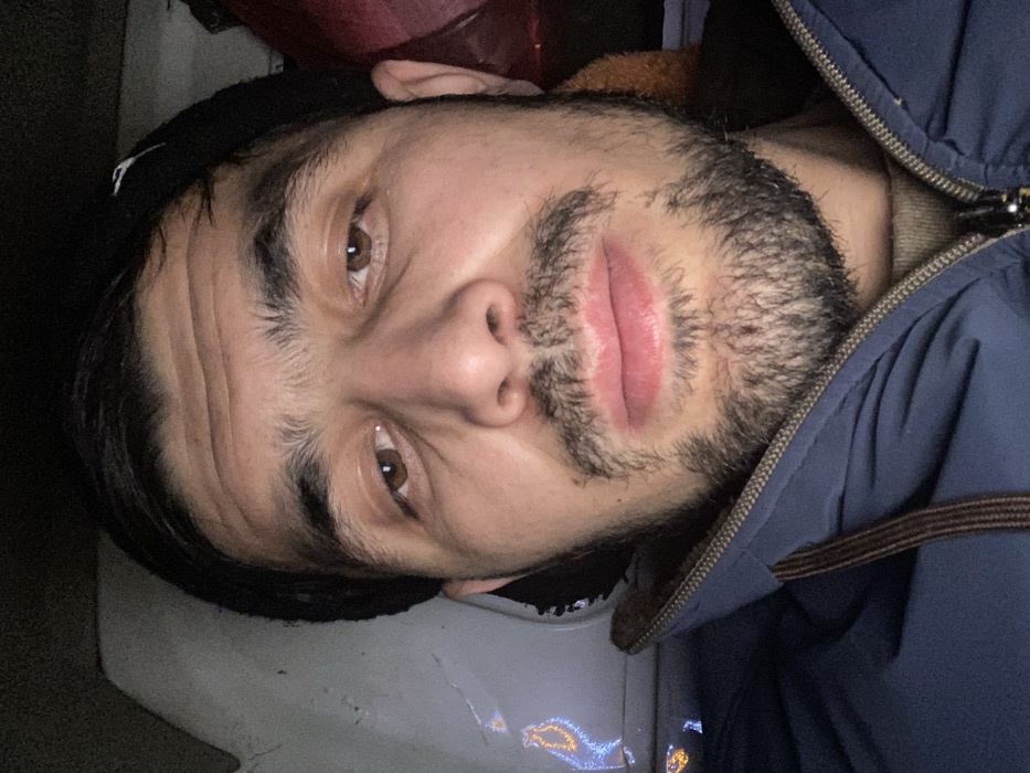 A man with brown eyes and a trimmed beard is centered in the frame. He wears a black beanie and a blue zip-up jacket with a brown collar peeking out. The image appears to be taken indoors, possibly in a car or a room with dull lighting and gray or white surfaces visible around the man. He is facing the camera with a slight upward tilt of his head.