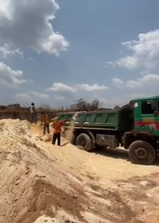 three people loading sand into a green dump truck. They are using shovels to move the sand from a large pile. The sky is blue with white clouds. The dump truck is parked next to the sand pile. The ground is sandy and dusty. The workers are wearing casual clothes and safety vests.