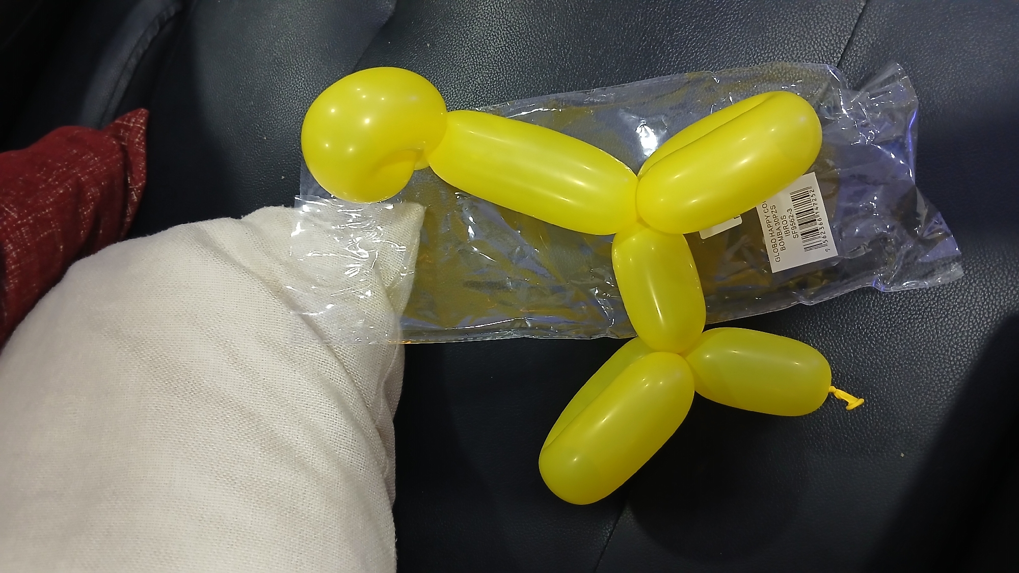 A yellow balloon animal, resembling a stylized dog, is centrally positioned. It is composed of multiple inflated, elongated yellow latex balloons twisted and connected to form a head, body, and four limbs, with the tail end visible as a knotted protrusion. The balloon animal partially rests on its clear plastic retail packaging, a bag with a white adhesive label. The label displays text including "GLOBO HAPPY CO", "BOMBA 30PZS", "IBROS", "SF9562-3", and a barcode beginning with "9 562366 147252". This entire setup is situated on a dark, textured surface consistent with black or dark grey faux leather upholstery. In the upper left background, a substantial portion of an off-white, coarse-woven fabric cushion is visible, partially obscuring a red, patterned fabric object. No individuals are present in the image. The scene is depicted as occurring in the city of Tacarigua, Venezuela.