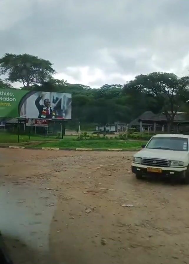view from a moving vehicle on a road in what appears to be a rural area. A white pickup truck turns onto the road from the right. A large billboard featuring a person in a suit with a raised fist is visible in the background, along with some buildings partially obscured by trees and vegetation. The sky is overcast. The road is paved but appears to be dirty.