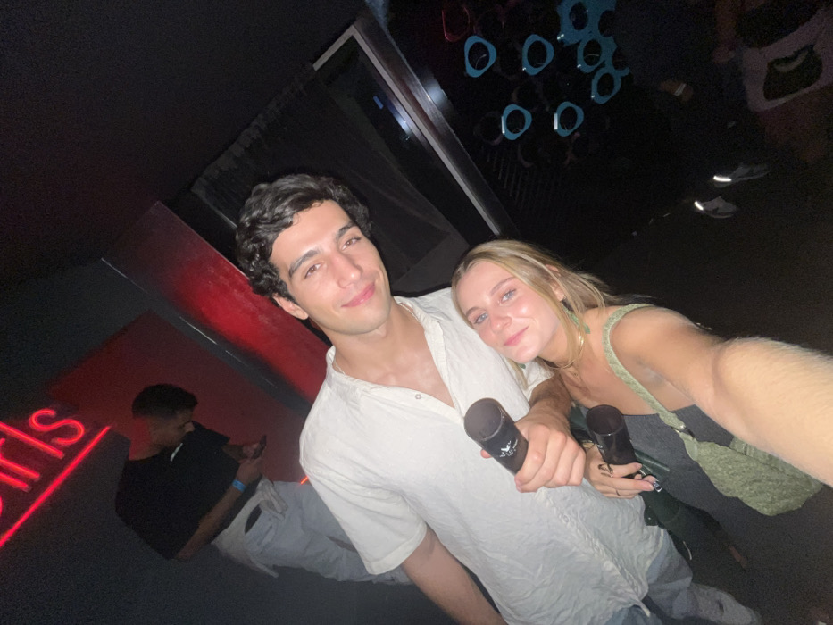 This image, captured in Lisbon, Portugal, shows two primary individuals posing for a selfie in a dimly lit indoor setting