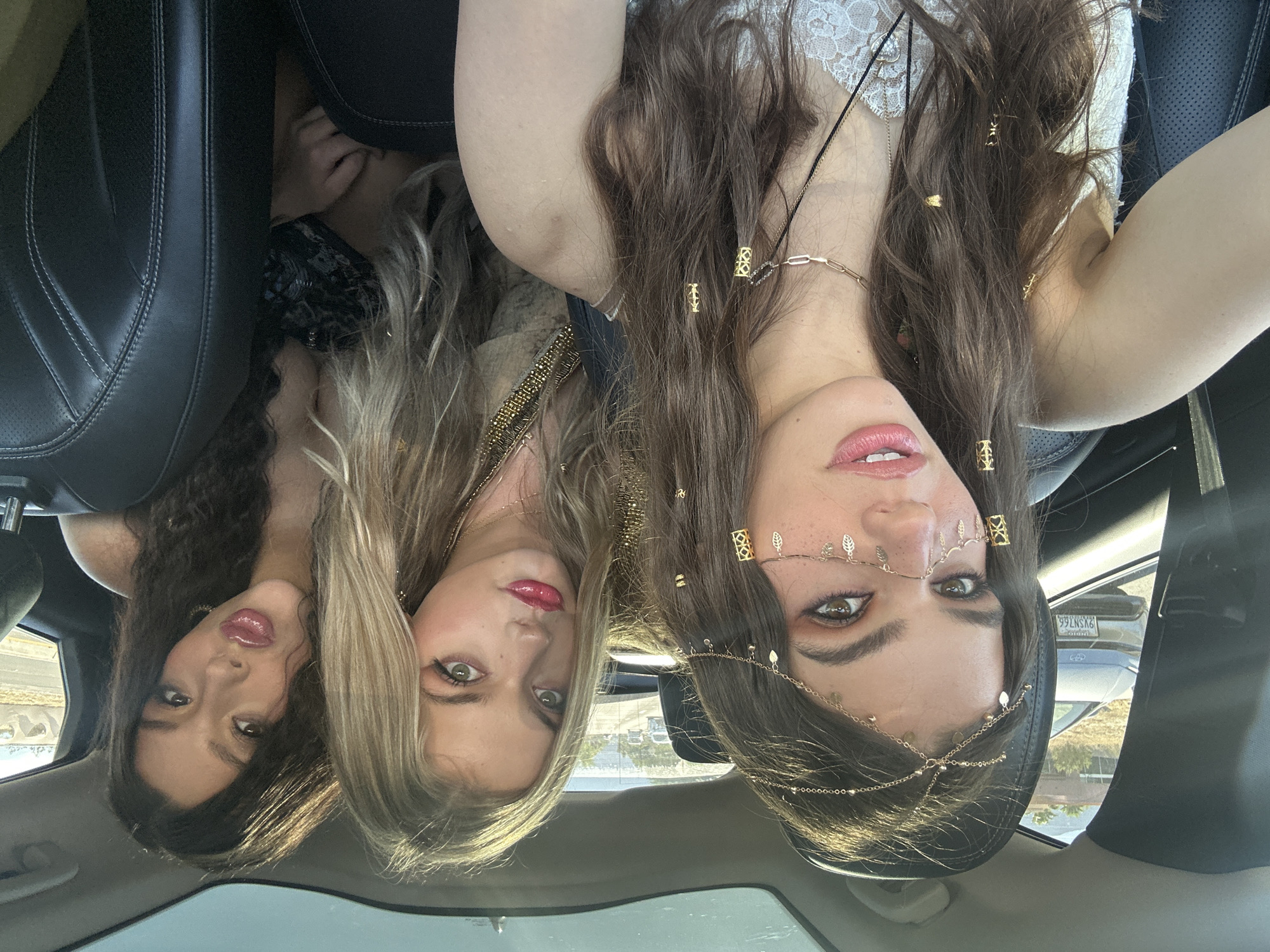 Three women are posing for a photo in what appears to be the interior of a car. The image is oriented upside down. The woman on the right has dark brown hair with a decorative gold chain on her forehead and gold hair accessories. The woman in the middle has blonde hair and is wearing gold jewelry. The woman on the left has curly dark brown hair. The location, identifiable through the windshield reflection, is a parking lot in Rancho Mirage, California, USA. Cars and some vegetation are visible in the background.