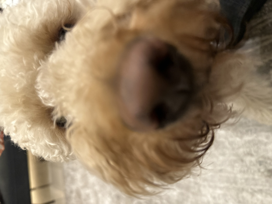 - "The image presents an extreme close-up of a canine, identified as a dog with light, curly fur, consistent with a poodle or doodle type breed" by FM-OdduO2, licensed under CC BY 4.0