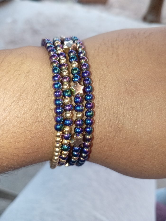 A human forearm with a medium-dark skin tone and fine hair is depicted, positioned vertically. Five individual beaded bracelets encircle the wrist. Three of these bracelets consist of small, spherical beads exhibiting an iridescent finish, displaying varying shades of purple, blue, and green. Two bracelets feature uniform small, spherical, metallic gold-colored beads. Two of the iridescent bracelets each contain a small, five-pointed star-shaped charm, appearing to be made of copper or brass. A blurred, light-colored fabric, consistent with clothing, is visible in the lower left portion of the background. The remaining background is indistinct and out of focus. The requested location of Santo Domingo, Venezuela, cannot be determined from the visual information present in the image.