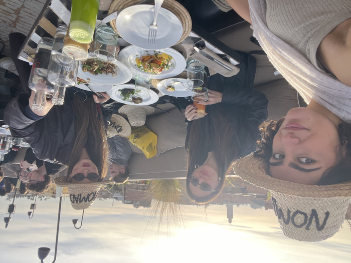 The image depicts three women seated at an outdoor rooftop restaurant, identified by the straw hats bearing "NOMAD" branding, strongly suggesting Nomad Marrakesh