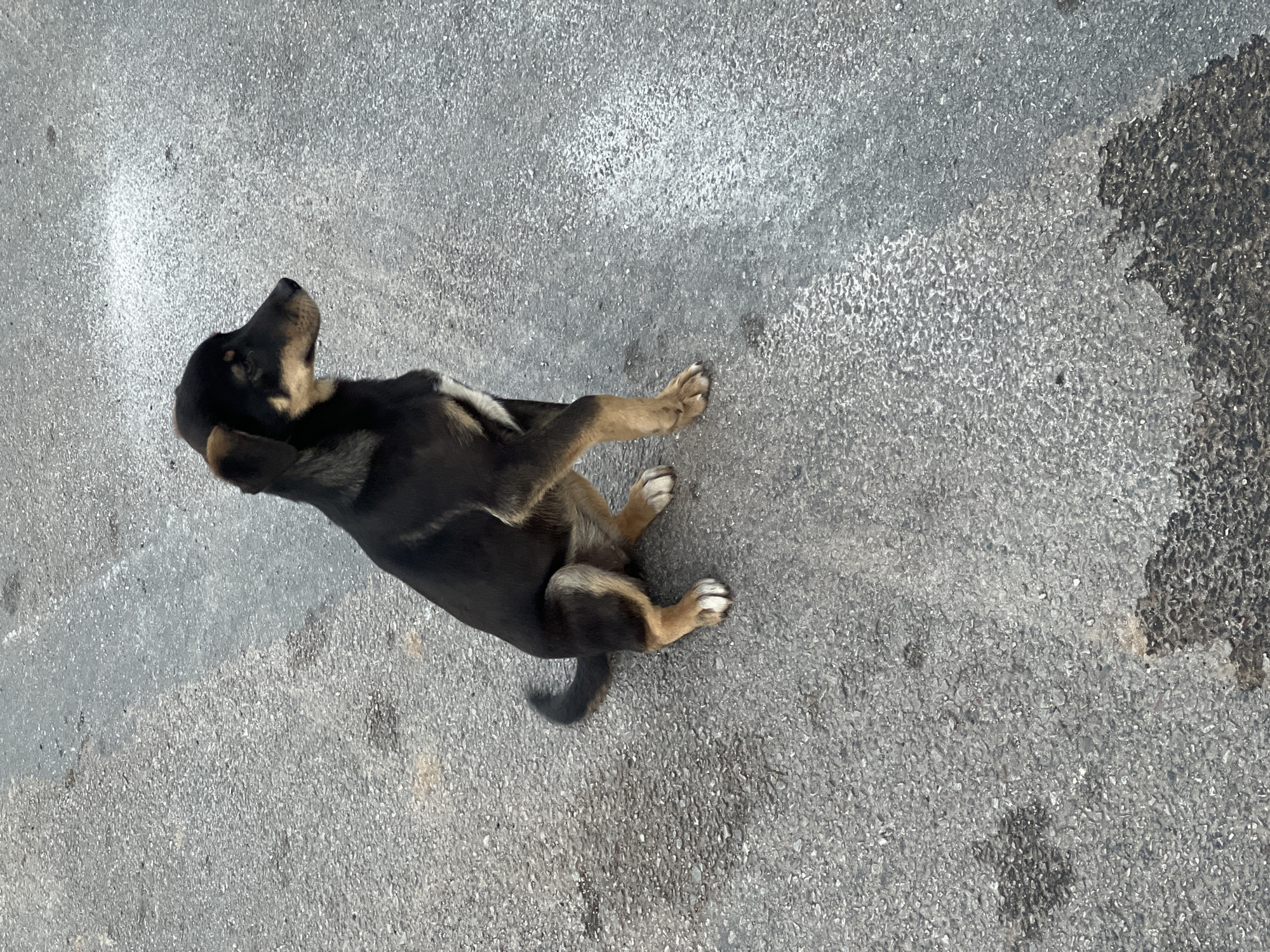 - "A black and tan dog sits on a gray asphalt surface" by FM-cRS3a2, licensed under CC BY 4.0