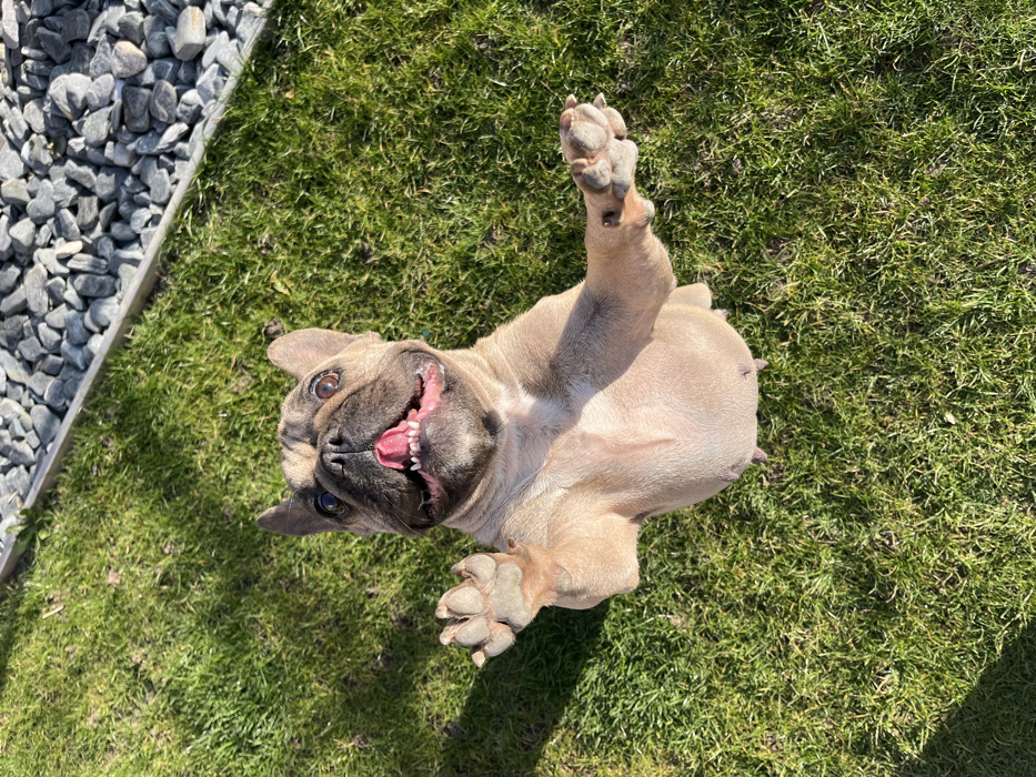 - "A fawn-colored French Bulldog is depicted outdoors in Sheynovo, Bulgaria, standing on its hind legs with its front paws raised and extended upwards" by FM-yO5cv1, licensed under CC BY 4.0