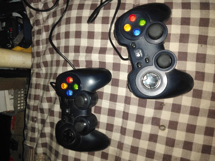- "The image displays two black wired Logitech gaming controllers resting on a brown and off-white checkered fabric surface" by FM-f4dh13, licensed under CC BY 4.0