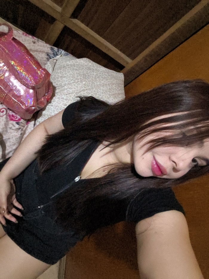 The image displays a female individual situated in an indoor environment. The precise location within Juan Griego, Venezuela, cannot be determined from the visual content. The subject is positioned diagonally across the frame, looking towards the camera with a slight smile. She has long, dark hair, partially obscuring her face, and is wearing pink lipstick. Her attire consists of a black, short-sleeved top featuring a silver zipper, partially open, on the front. Her right hand, adorned with a ring on the ring finger, rests on her midsection. In the upper left portion of the image, a shiny, iridescent pink handbag with a holographic appearance is visible, resting on a bedspread patterned with pink and white roses. A light-colored pillow with a speckled or leopard print pattern is situated behind the individual's head. The background reveals dark brown wooden ceiling or wall paneling in the upper right and a plain orange-brown wall section behind the subject's right arm. The lighting in the scene is dim.