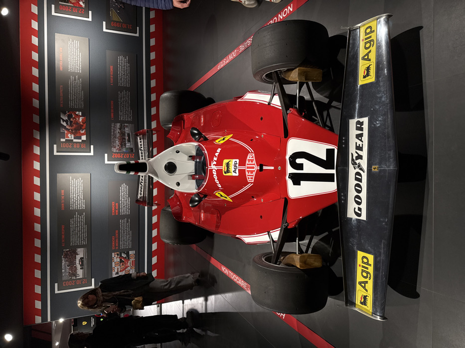 The image depicts the interior of the Ferrari Museum located in Maranello, Italy