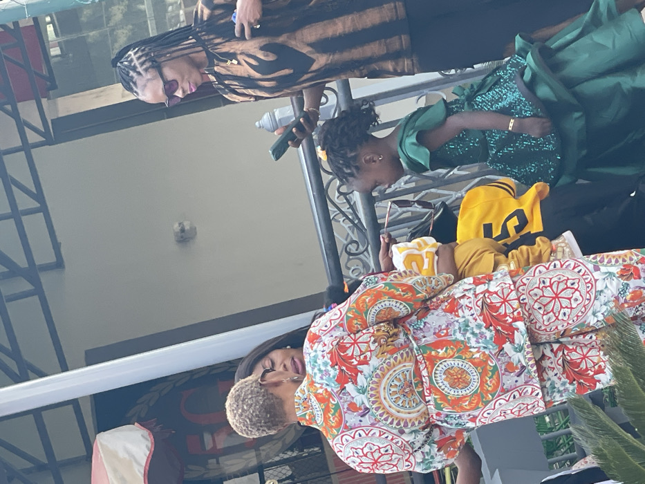 Three women and a child are visible, seemingly at an outdoor event. One woman in an orange, white, and red patterned suit sits with a small child dressed in yellow with a matching "5" jersey. Above them, a young girl in a green dress looks down. A third woman in a brown and black striped top holds a phone. They appear to be on a raised platform with metal railing.