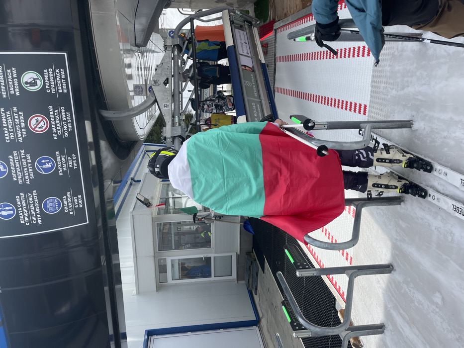 A person wearing a black ski helmet with yellow accents, a black jacket, and black ski pants stands on skis at a ski lift boarding station in Stoikite, Bulgaria. A large Bulgarian flag, displaying horizontal white, green, and red stripes, is draped over their back. The individual is positioned between grey metal barriers with green tips, holding ski poles, facing an approaching blue and grey ski lift chair numbered "33." The ground beneath is covered in snow with white, red-striped matting leading to the chair. Overhead, black signs with white text in both Bulgarian and English provide ski lift safety instructions, including warnings about the safety bar, seating, and backpack orientation. To the left, a small, white, modular building with blue trim and windows is visible. Inside, at least two individuals are present, one in a blue uniform. A blue shovel and a small green flag on a pole lean against the building's exterior. Another person's gloved hand holding a ski pole is partially visible in the lower right foreground. The overall scene depicts a winter recreational setting at a ski resort.