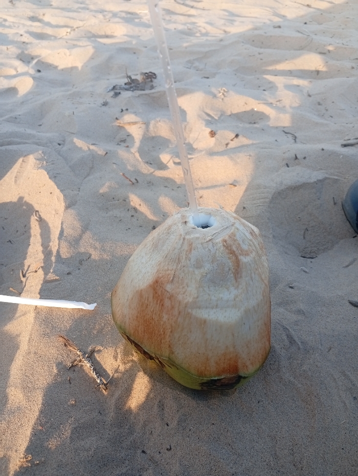 A partially de-husked, light beige and green coconut rests on fine-grained, light beige sand. A clear plastic drinking straw is inserted vertically into a circular aperture at the top of the coconut. To the immediate left of the coconut, a white plastic straw lies horizontally on the sand, bent at an approximate 30-degree angle. Scattered small pieces of organic debris are visible on the sand, which displays minor undulations. Long shadows are cast from the coconut and other small objects, consistent with a low sun angle. A dark blue object, possibly footwear, is partially visible in the upper right quadrant of the image. The scene is situated on a beach in Shella ward, Kenya. No individuals are present.