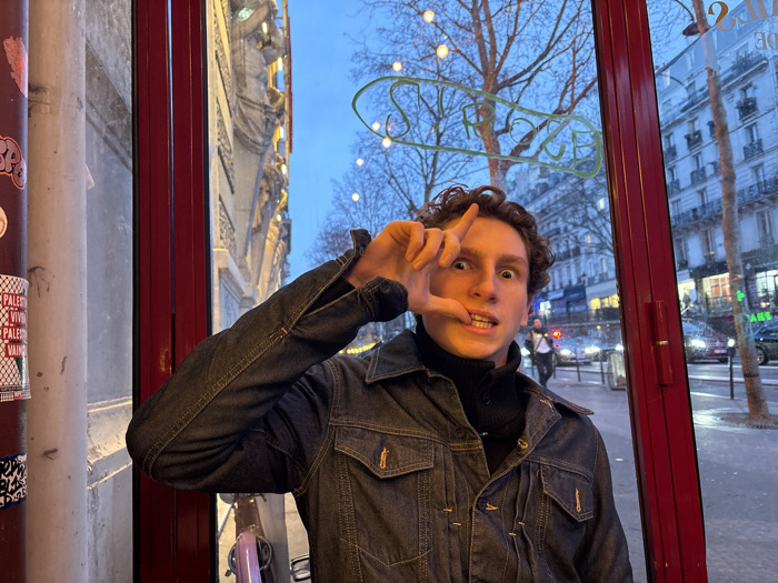 A young man with curly brown hair, wearing a denim jacket and black turtleneck, stands inside what appears to be a Parisian café. He’s making a silly face, pulling at his lower lip with his fingers while also forming an "L" with his hand on his forehead. Outside the cafe window, typical Parisian buildings and street scenes are visible, including cars and pedestrians. The cafe's window displays cursive writing on the glass.