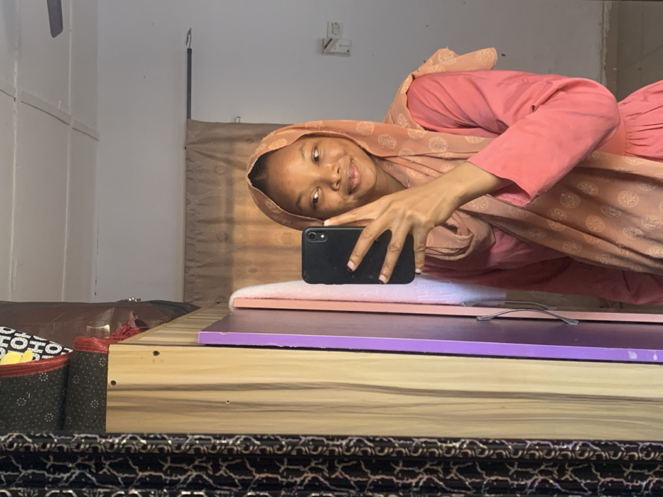 The image depicts a selfie reflection of a young adult female taken indoors in Ilorin, Nigeria