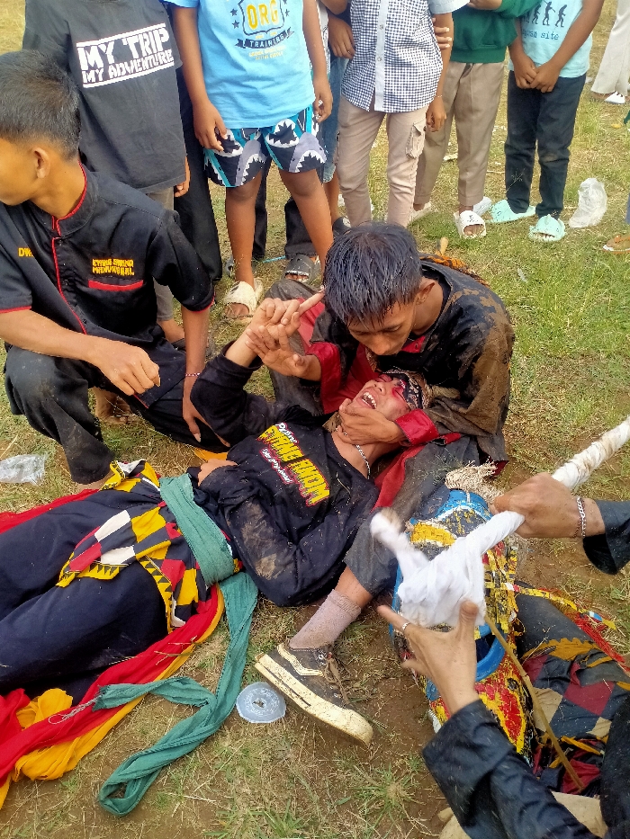 The image depicts an outdoor scene in Sidomukti, Indonesia, involving a group of individuals on a grassy, partially muddy area. In the foreground, a young individual is lying supine on the ground, wearing a black long-sleeved shirt with yellow text, dark trousers, and mud-stained black sneakers. A red, yellow, and black patterned fabric, along with a green sash, is wrapped around their lower body. Their face is contorted, eyes open, mouth agape, with a dark substance visible on their forehead/hairline. Kneeling over this individual is another young person, wearing a mud-stained dark long-sleeved shirt with red accents. This person holds the supine individual's jaw/chin with one hand and clasps their raised hand with the other. Their expression is focused, leaning in towards the supine individual's face. To the left, a third individual kneels, wearing a black uniform-style shirt with a mandarin collar and yellow accents, including text that partially reads "DW." and "KAB. SIDOMUKTI" (referring to Sidomukti Regency). This person observes the interaction. In the bottom right, two hands are visible: one holds a white cloth wrapped around a stick-like object, while the other touches the lower body of the supine individual, which is adorned with blue and patterned fabric. Several other young individuals stand in the background, observing the scene. They wear various casual attire, including t-shirts with text such as "MY TRIP MY ADVENTURE," "ORG TRAINING," and "SITE," along with shorts, trousers, and a checkered shirt. Some wear sandals. The ground is covered with sparse grass and patches of mud, with a clear plastic bottle and a white plastic container visible nearby.