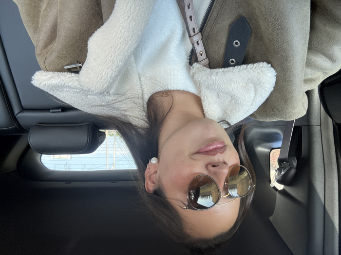 A person with brown hair and round sunglasses poses inside a car. The individual wears a light-colored, fuzzy collar jacket over a white sweater. The car's interior features dark leather seats and trim, with a headrest visible in the background. A portion of the car window shows a blurred outdoor scene. The photograph appears to be taken from a slightly elevated angle, with the camera capturing the person and interior details of the vehicle.