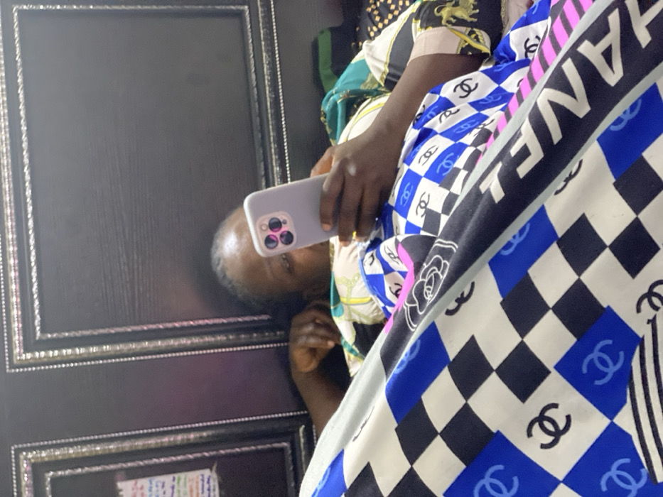 A woman holds a smartphone, possibly taking a selfie. She's positioned in front of a dark door or wall adorned with a decorative frame. She wears a colorful garment featuring prints, including the Chanel logo and geometric patterns. The fabric is draped across her lap. The focus of the image is on the person and the phone.
