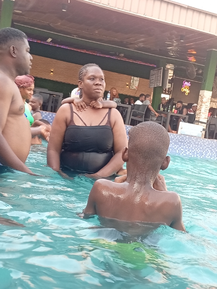 People are enjoying themselves in a swimming pool. A woman in a black swimsuit stands in the water with a child's arms around her neck. To her left, a shirtless man stands partially submerged. In the foreground, the back of a young boy's head and shoulders is visible. Behind them, under a covered area, are tables with seated individuals. A sign reads "Good Vibes Only." The pool is surrounded by patterned tiles.