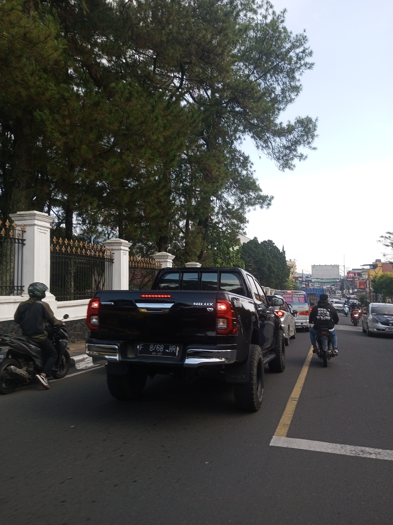 street scene in what appears to be an urban area, with traffic congestion. A black Toyota Hilux pickup truck is in the foreground, viewed from the rear. A motorcyclist wearing a helmet and jacket is beside the truck on the left side of the frame. Several other vehicles, including cars and motorcycles, are visible further down the road, indicating moderate to heavy traffic. Buildings and trees line the street, and white posts and a metal fence are on the left. The sky is overcast. A license plate on the truck is partially readable and shows the letters "F" and "HR". Based on the prompt, the location is Mya Sit Kaing Ywar Thit, Myanmar.