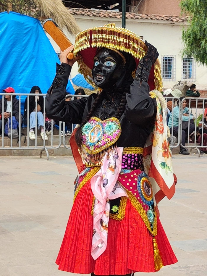 A color photograph features a person in a traditional Peruvian costume standing in a public area. The person wears a black mask, a black jacket, a red pleated skirt, and a large, ornate hat. The costume is adorned with colorful decorations, including a heart-shaped emblem, ribbons, and tassels. Other people are seated behind a barrier in the background. The scene is set in a town square or similar public space with brick buildings.