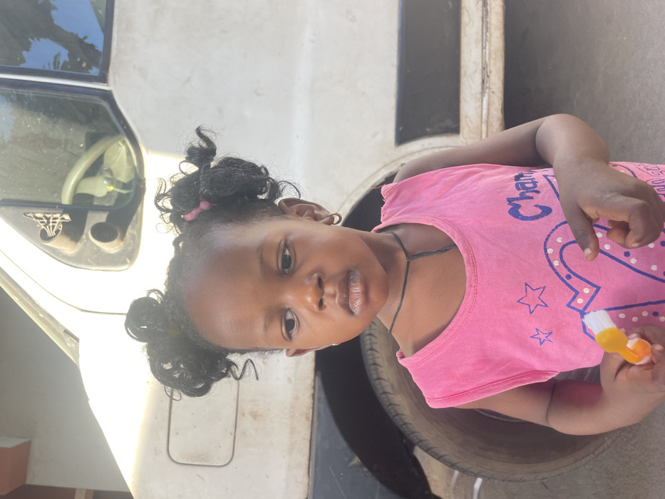 A young girl with braided pigtails stands in front of a white vehicle. She wears a pink top adorned with a blue design and a black necklace. Gold earrings dangle from her ears. She holds a yellow and white object in her hand. The vehicle features a window with a visible steering wheel and a black tire adjacent to the girl.