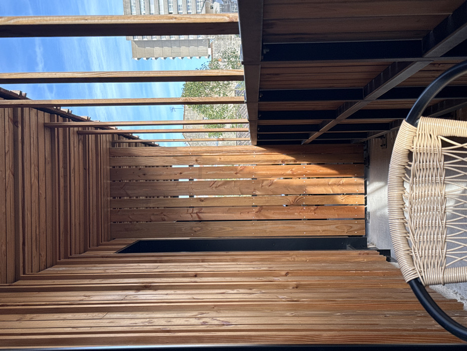 This image displays an outdoor balcony or loggia in Bordeaux, France, under bright daylight conditions. The architectural style prominently features light-toned wooden slats: vertically oriented on the left wall and horizontally on the ceiling, with visible grain and knots. A dark-framed doorway is recessed into the left wall. The floor is a light-colored, textured surface, likely concrete. In the bottom foreground, the upper portion of a vacant beige wicker-style chair with a curved black metal frame is visible, facing outwards. The right side of the balcony features a balustrade and partial privacy screen constructed from a dark horizontal top rail, alternating dark vertical metal posts, and vertical light-brown wooden slats. A lower section beneath the main balustrade is also clad with horizontal wooden slats. Beyond the balcony structure, under a clear blue sky, distant urban elements are visible. These include a multi-story, light-grey concrete building with multiple windows on the right, and a lower building with a gabled, tiled roof and a television antenna further to the left. Green tree foliage is present between the balcony and the distant structures. Sunlight casts sharp vertical shadows from the wooden elements onto the floor and inner surfaces, indicating a high sun angle. No individuals or specific actions are depicted.
