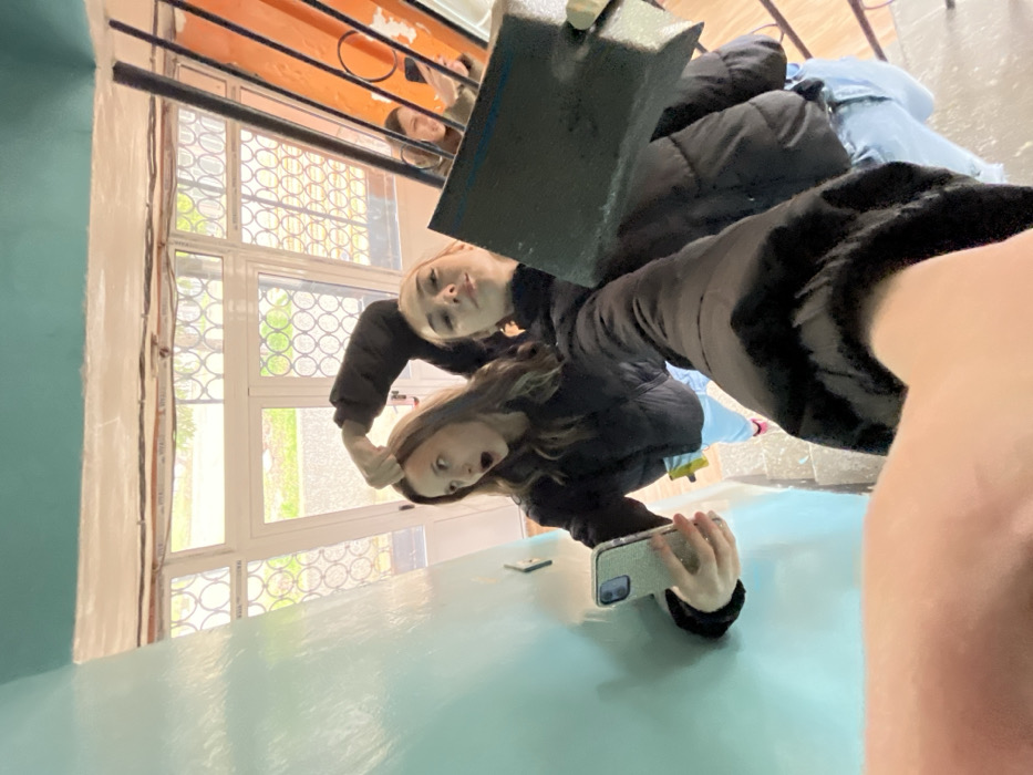 The image depicts two young females posing for a selfie within a stairwell in Cherven Bryag, Bulgaria