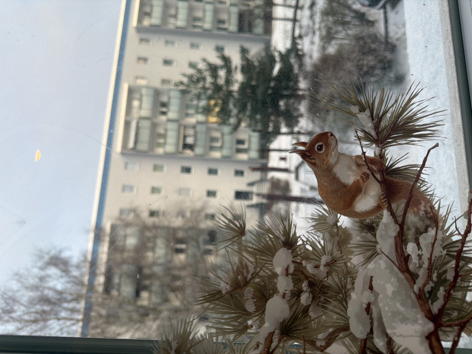 A squirrel, positioned among snowy pine branches, faces left with its mouth slightly open. The scene is viewed through a window, with a tall building visible in the background. Reflections of the outdoors are subtly apparent on the glass. Snow is present, suggesting winter conditions. A small, yellow object appears near the upper left corner of the frame.