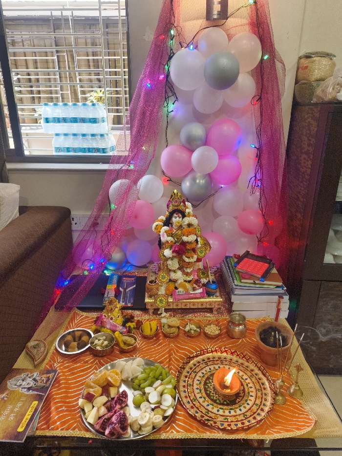 A decorated altar features a statue adorned with flowers, surrounded by offerings of fruit, sweets, and nuts in small bowls. A lit diya sits on a decorative plate. Behind the statue, a backdrop of pink tulle is decorated with white, pink, and silver balloons and fairy lights. Stacks of books, pens, and water bottles are nearby. A window with a stack of bottled water is visible in the background. Incense sticks smolder in a pot.